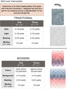 Interwoven is an block-based pattern that plays with lines and movement. I designed this quilt as a gift for my husband and as a representation of our journey through life.